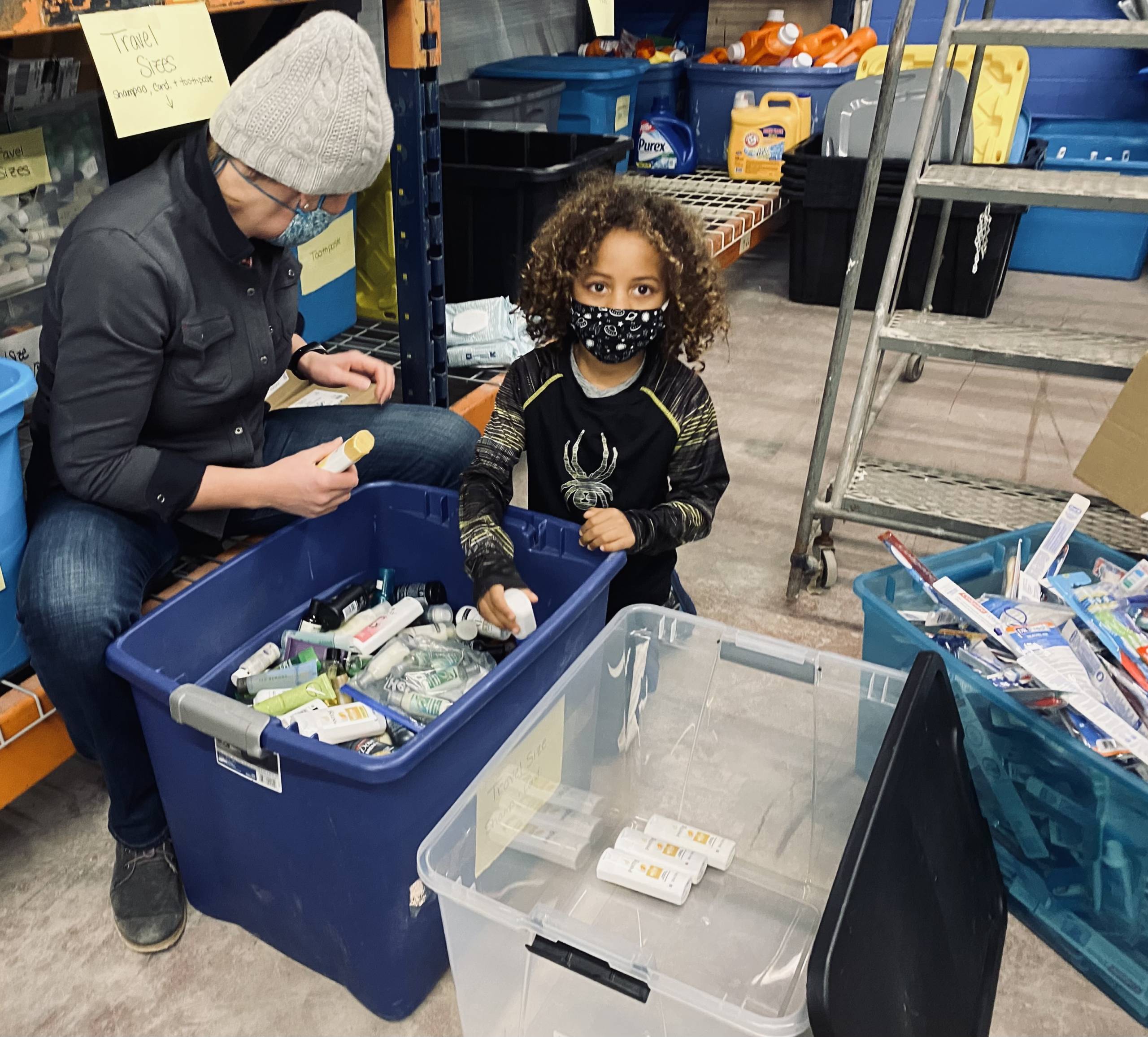 “His teacher says he’s an eager learner,” said Katy Martey of her Webster Elementary School second-grader. The two quietly worked together sorting travel-size containers of shampoo, conditioner and other toiletries.