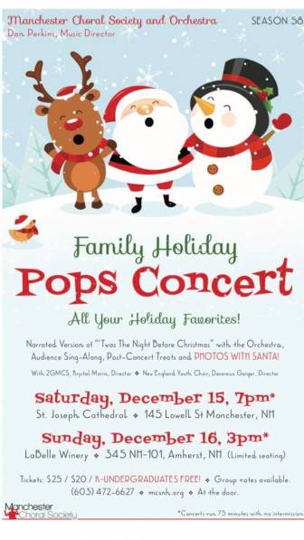 Join the Manchester Choral Society for these special family concerts featuring all of your holiday favorites plus a narrated version of “‘Twas the Night Before Christmas” with the orchestra and an audience sing-along with the Manchester Choral Society and Orchestra, the MCS children’s chorus (2G MCS), and the New England Youth Choir. Bring the whole family and enjoy post-concert holiday treats and photos with Santa. Admission is free for students K-Undergraduate!