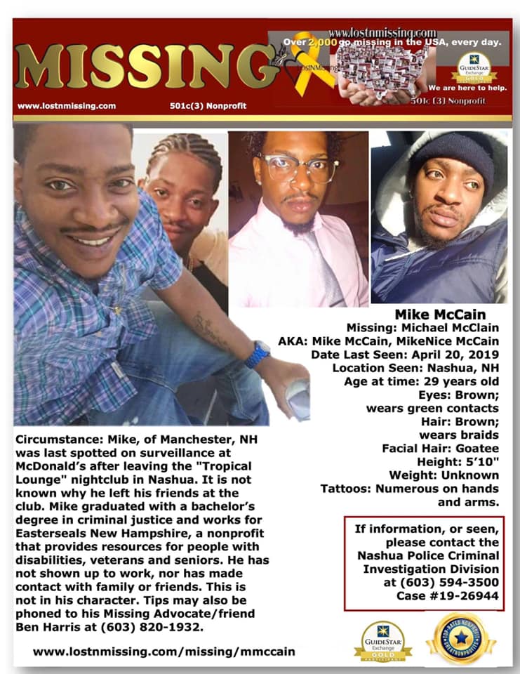 According to his friends Michael McCain, 29, left the club after a fight broke out at the Tropical Lounge on West Hollis Street in Nashua Saturday night. McCain was not involved in the fight, according to two friends who were with him. But after the crowd dispersed, McCain was not anywhere to be found. His friends said they waited for him for about 45 minutes, into the early morning hours, then returned to Manchester. McCain was last seen on surveillance footage at the McDonald’s on East Hollis Street, according to posts on Facebook.