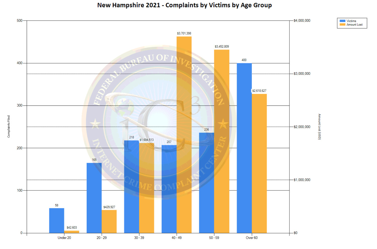 In New Hampshire, 1,487 victims reported cyber crimes to IC3, with a total $15,302,618 lost. While the largest age group of victims was over 60, with 400 complaints and $2,618,627 lost, the greatest average amount lost was to the 40-49 age group, where 207 complaints reported being scammed out of $3,701,398.