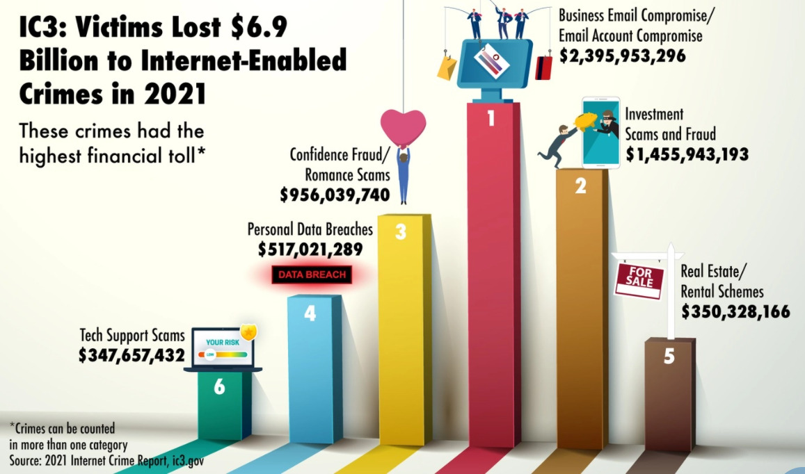 The top three cyber crimes reported to IC3 in 2021 were phishing scams, non-payment/non-delivery scams and personal data breaches. The biggest money losses were from scams involving compromised email, both for businesses and individuals, investment fraud, and romance and confidence fraud.