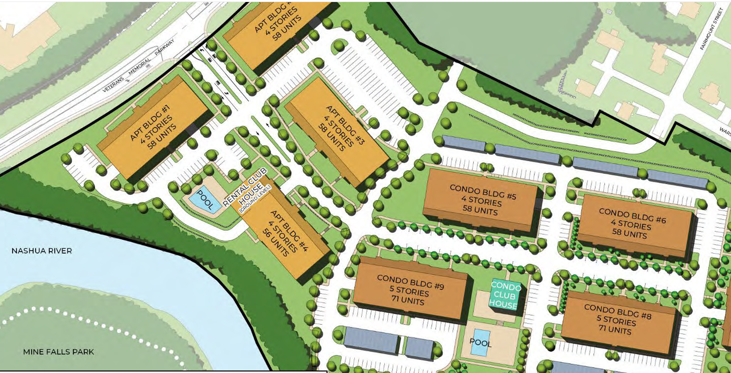 A conceptual rendering shows eight of the nine apartment and condominium buildings planned for the former Mohawk Tannery and Fimbel Door Corp. sites in Nashua. Conceptual renderings are not final site plans, and may change before a project is approved. Image/Blaylock holdings