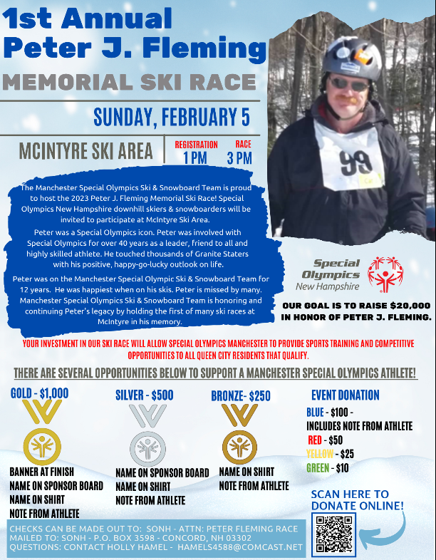 MANCHESTER, NH โThe Manchester Special Olympics Ski & Snowboard Team is hosting the inaugural Peter J. Fleming Memorial Ski Race on Feb. 5 at McIntyre Ski Area!
