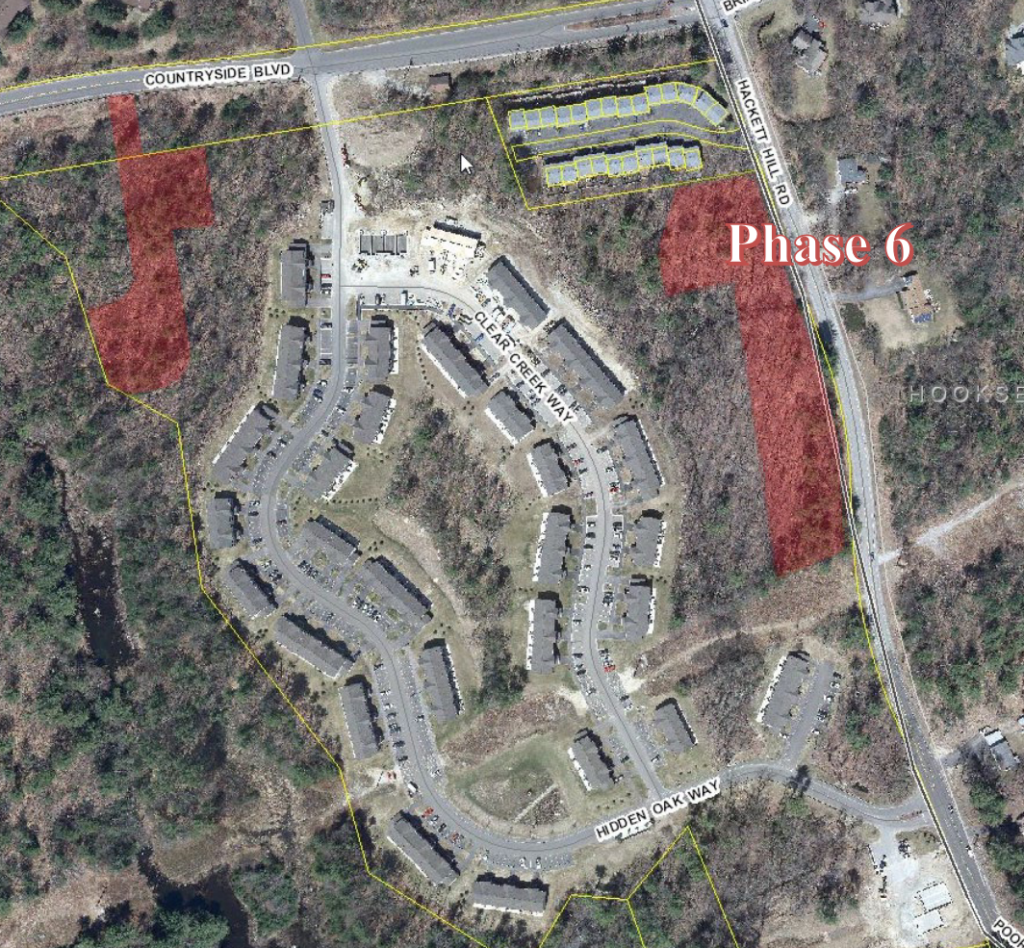 Applicant has submitted a planned development and site plan amendment for a Phase 6 expansion of the Hidden Oak development. The proposal includes adding (20) twenty townhouse units, within (4) four buildings, to the 152 units existing on-site in addition to a 1010 sq. ft. clubhouse addition. Access for these new residential buildings is proposed by creating two new curb cuts on Hackett Hill Road within the Hooksett town line.