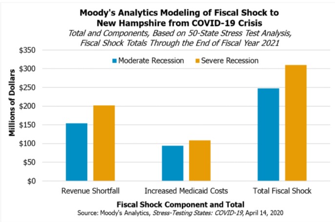 Moody’s Analytics estimated New Hampshire would see revenues drop between $153.9 million and $201.9 million through the end of State Fiscal Year 2021. The additional increased Medicaid costs projected would bring the combined fiscal costs to between $247.9 million and $310.27 million, depending on the severity of the recession. While these figures are the result of a 50-state analysis and are not a detailed look at New Hampshire’s revenue system, they provide some indication of the revenue shortfalls the state may face.