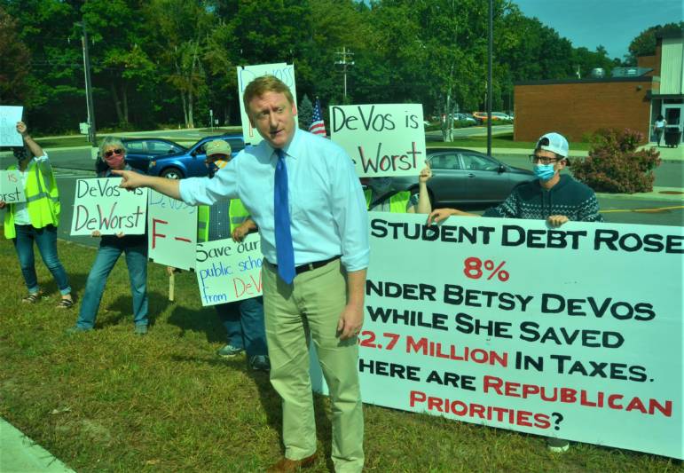 BEDFORD, N.H. โ With U.S. Secretary of Education Betsy DeVos scheduled to appear at two schools in Bedford, Democratic Party Gubernatorial Candidate Dan Feltes was on hand with a group protesting the DeVos visit to share to describe why he would be a better choice than incumbent Chris Sununu.