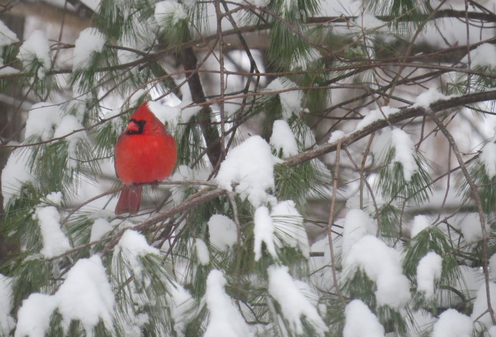 Hatchling cardinals are given the heave-ho after one week in the nest though the male then takes on feeding duties. Before nesting the male tries to impress a potential mate with his procuring skills, bringing her seeds that they then may share. The species has 16 songs, the most common being a “ti-ti-ti-ti-TI-TI-Ti” and a pair can sing a duet.