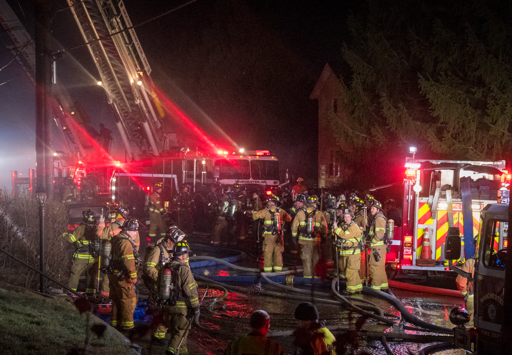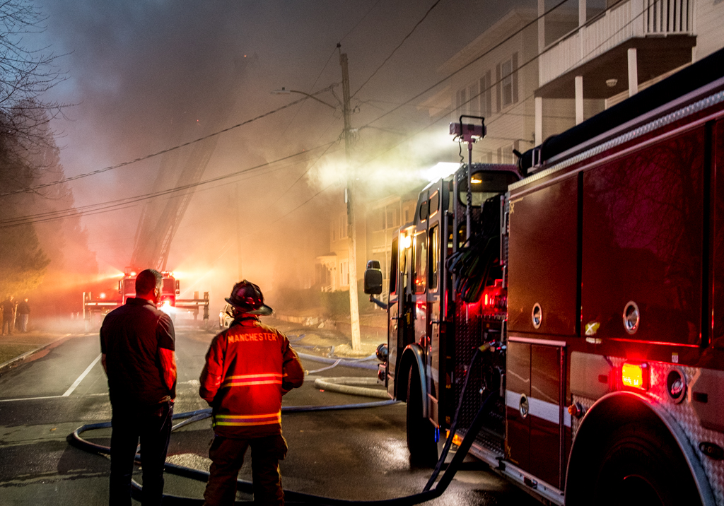 MANCHESTER, NH โ€” A three-alarm fire tore through a Spruce Street tenement building, displacing 10 people.