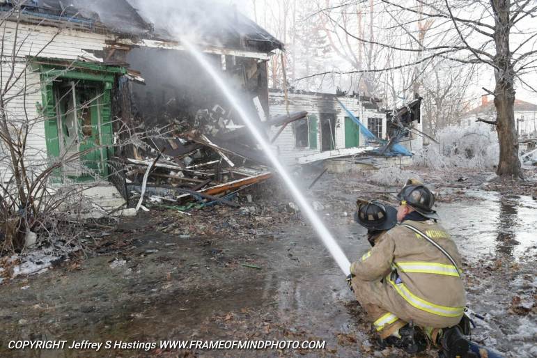 Firefighter douses structure at 417 Tarrytown Road. Photo/Jeffrey Hastings