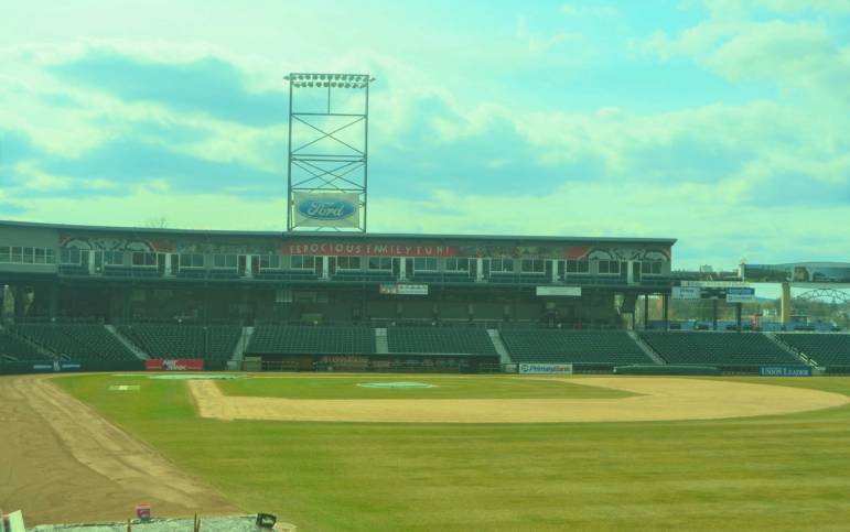 A view of the infield at Northeast Delta Dental Stadium in March 2020 from beyond the right field fence. Photo/Andrew Sylvia