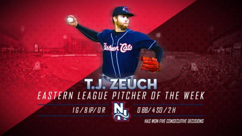 PORTLAND, Maine –ย On Monday, the Eastern League named New Hampshire Fisher Cat pitcher T.J. Zeuch as their latest Eastern League Pitcher of the Week.