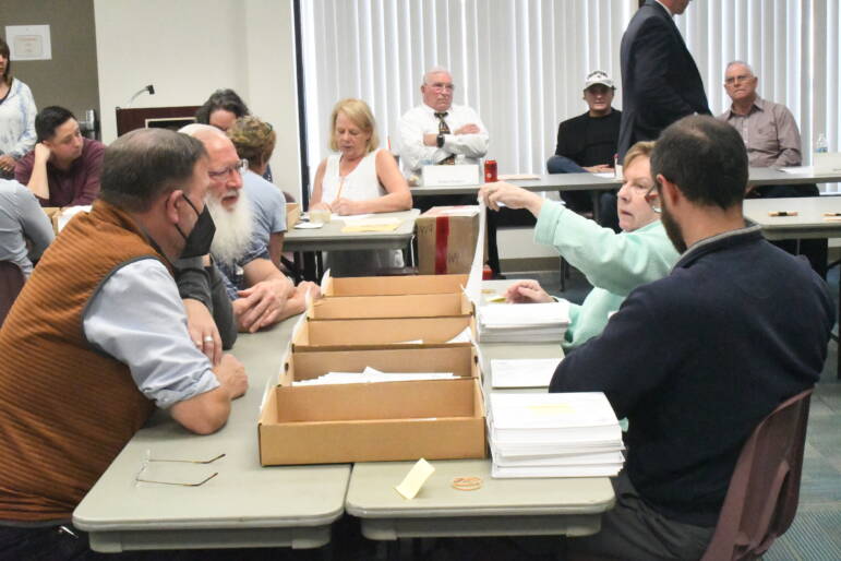 Ballots are inspected at the recount on Oct. 1, 2021. Photo/Andrew Sylvia