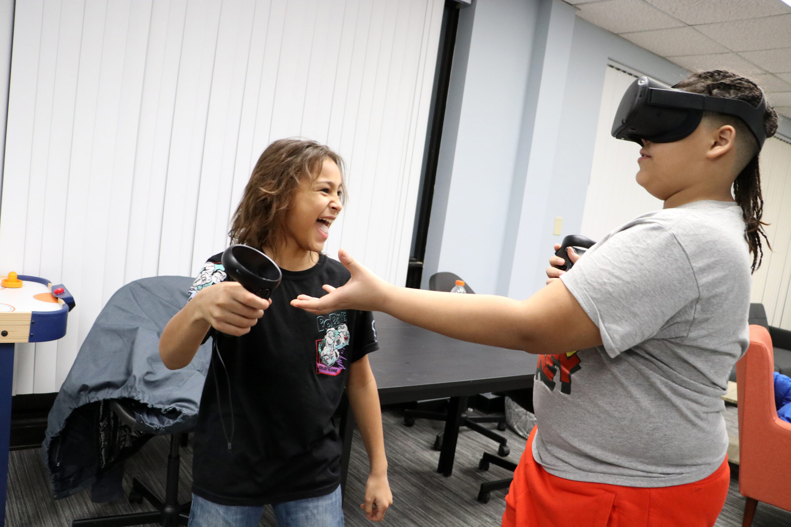 At the My Turn drop-in center on a Saturday evening. The new location is on Granite Street on the West Side of Manchester. Kids and teens were enjoying video games, augmented reality, pizza, relaxation, some magic tricks and more. Andres Rivera, 10 1/2, and his cousin Xavier Rodriguez, 12, were having fun sharing the augmented reality glasses there. Photo/Allegra Boverman