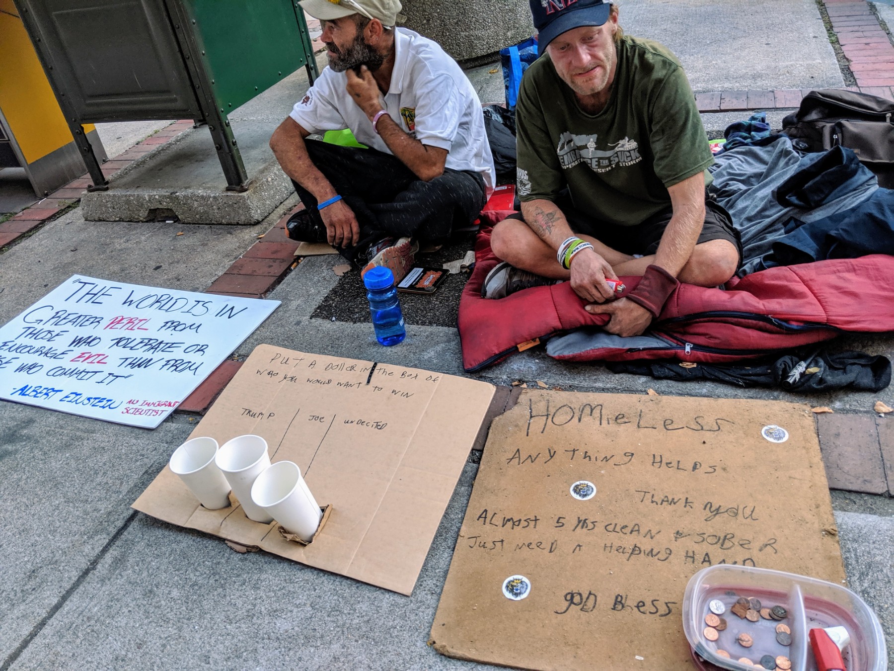 In front of them were a couple of cardboard signs with Styrofoam cups lined up. The sign read, “Put a buck in the box of who you want to win,” and the cups were labeled “Trump,” “Joe,” and “Undecided.” The other sign read, “Homeless, anything helps,” and “Thank you, almost 5 yrs clean + sober, just need a helping hand, god bless.” Alan wanted to make sure the “sober” part was noted.