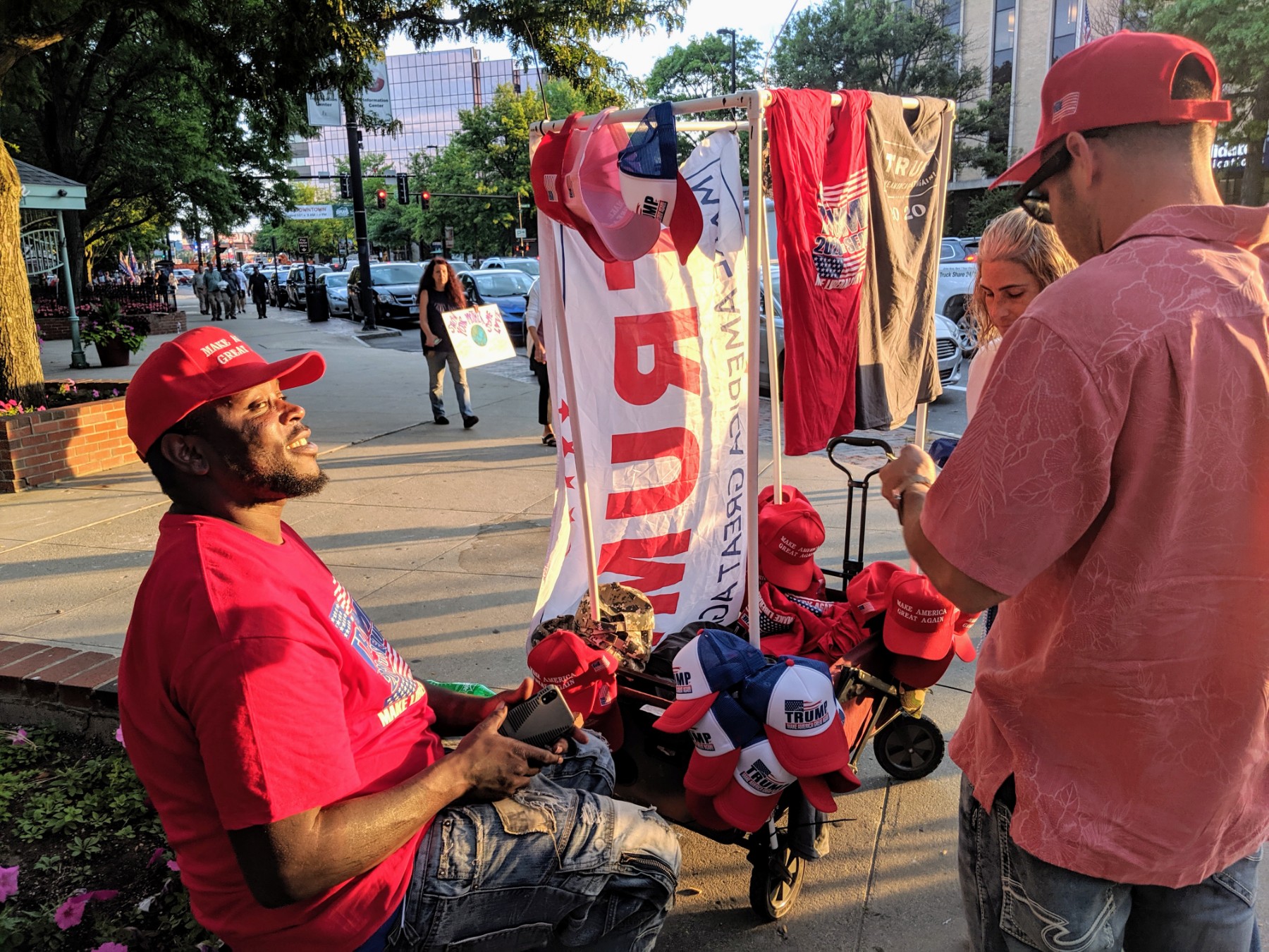 One guy who said he wasn’t tired of the Trump years yet was Joe Gilmore, of Columbia, SC, who was enjoying brisk sales at his MAGA hat (and other Trump swag) cart. He was parked at the corner of Merrimack and Elm.