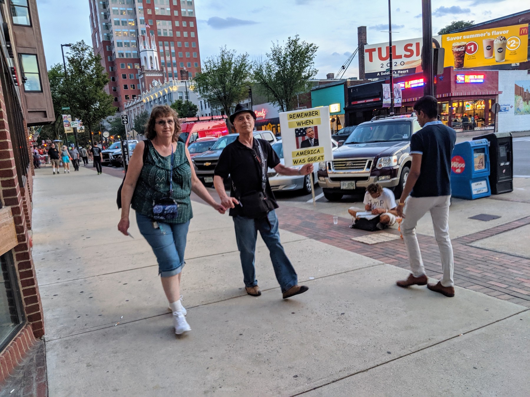 Among those milling around carrying rally signs were Brian Chick and his wife, Jean Thibierge, of Manchester. Chick’s sign featured a picture of President Obama, and read, “Remember when America was Great.”