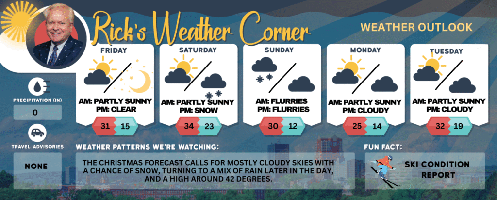 The Christmas forecast calls for mostly cloudy skies with a chance of snow, turning to a mix of rain later in the day, and a high around 42 degrees.