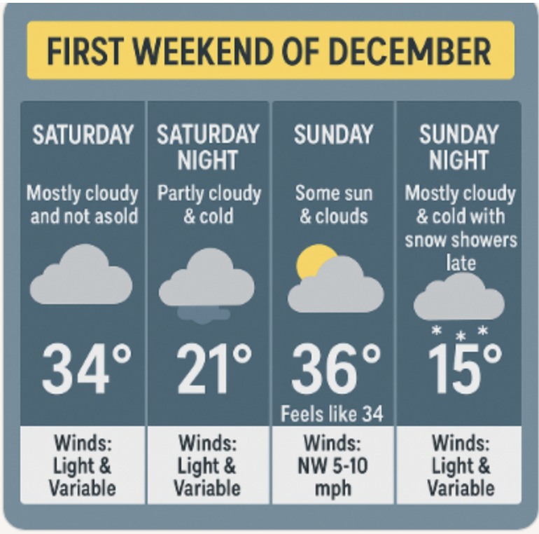 Sunday: Some sun & clouds. High 36 (feel like 34) Winds: NW 5-10 mph