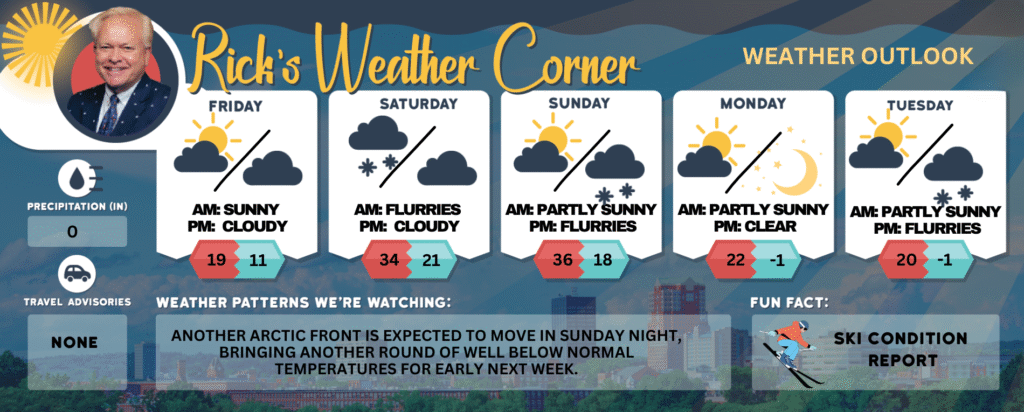 Bundle up, the coldest air of the season is upon us! We’re looking at mostly sunny skies, but don’t let that fool you—it’s going to be very cold out there, with a high of just 19 degrees. Expect gentle breezes from the southwest at 5 to 10 mph, adding a little chill to the air. Perfect weather for a cozy day indoors or a brisk stroll outside!