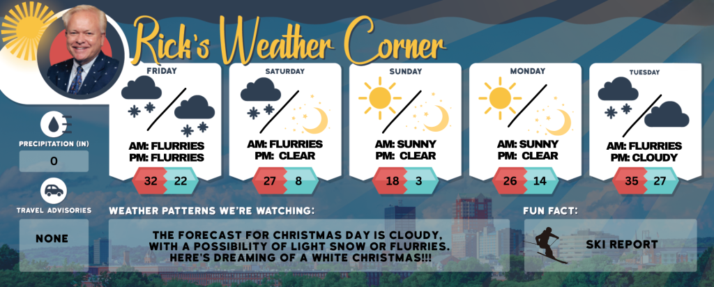The forecast for Christmas Day is cloudy, with a possibility of light snow or flurries. Here’s Dreaming of a White Christmas!!!