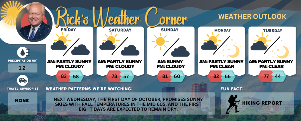 Next Wednesday, the first day of October, promises sunny skies with fall temperatures in the mid 60s, and the first eight days are expected to remain dry.