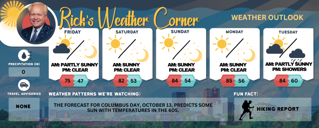 The forecast for Columbus Day, October 13, predicts some sun with temperatures in the 60s.