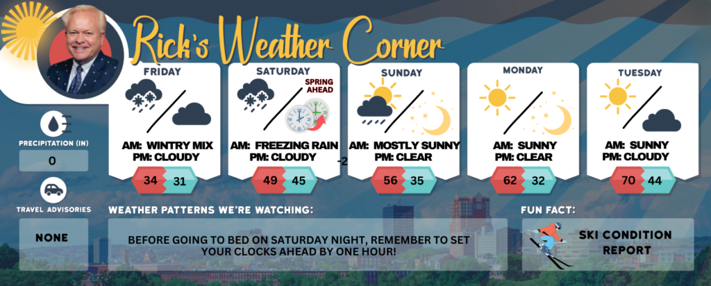 Friday: Colder; intermittent light snow and flurries in the morning followed by areas of drizzle in the afternoon; storm total 3-5โณ. High 34 (feel like 29) Winds: NE 5-10 mph