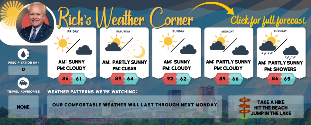 Today: Mostly sunny & comfortable. High 86 Winds: NW 5-10 mph