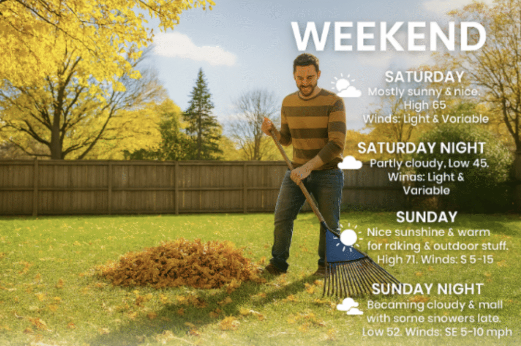 Sunday: Nice sunshine & warm for raking and outdoor stuff. High 71 Winds: S 5-15 mph