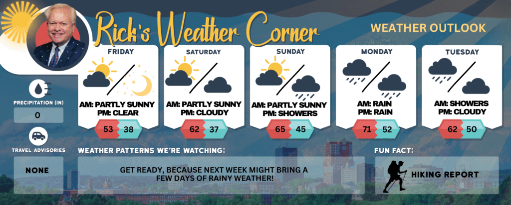 Today: Sunny & not as cool. High 63 Winds: NNW 5-15 mph