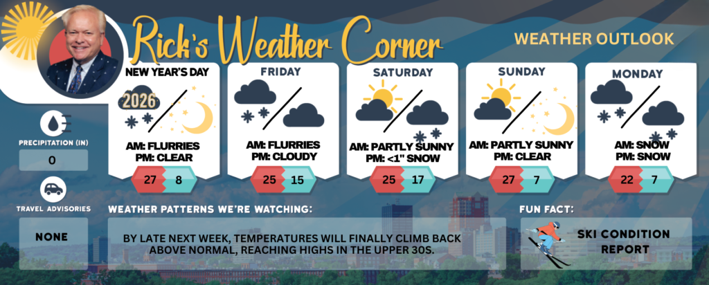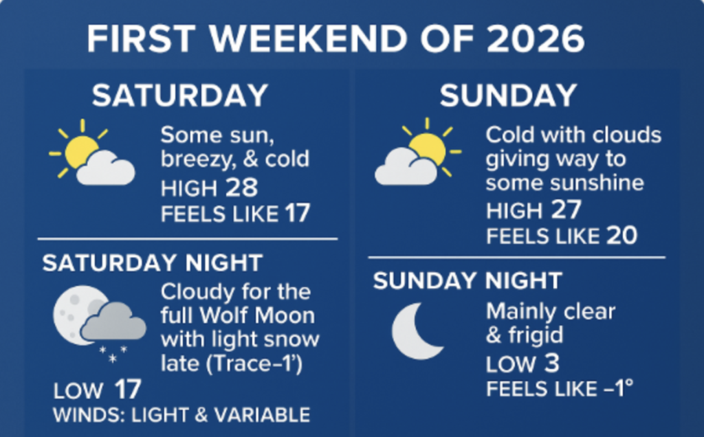 Sunday: Cold with clouds giving way to some sunshine. High 27 (feel like 19) Winds: NW 5-10 mph