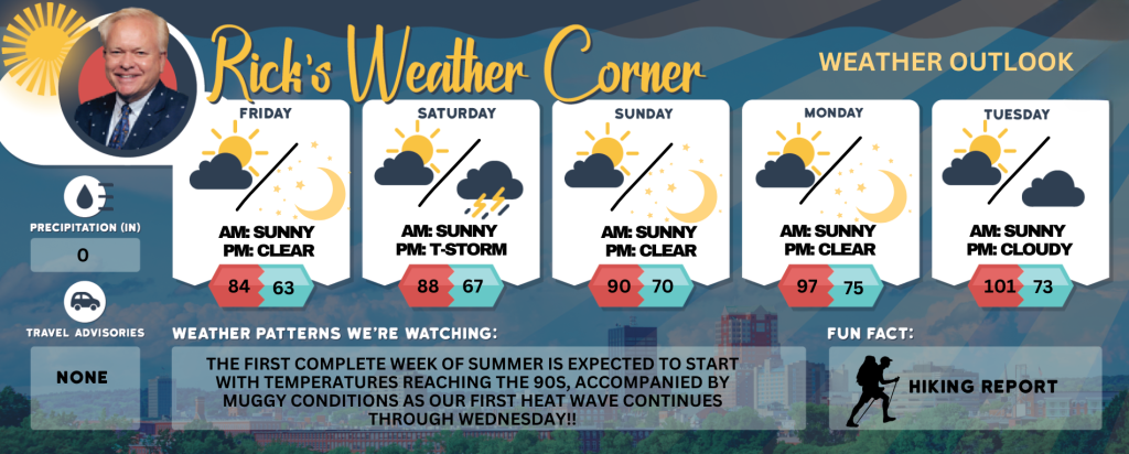 Sunday: Some sun, muggy, & hot marks the start of our first heat wave!! High 90 (feel like 93) Winds: W 5-15+ mph
