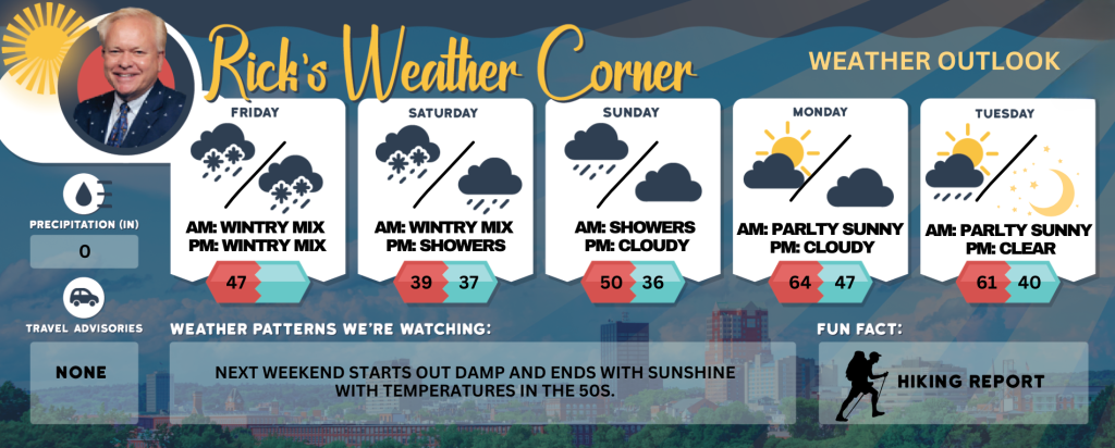 Friday: Early morning rain or snow showers otherwise cloudy & cooler. High 47 Winds: E 5-10 mph