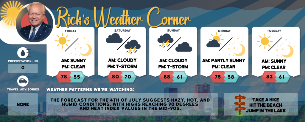 The forecast for the 4th of July suggests hazy, hot, and humid conditions, with highs reaching 90 degrees and heat index values in the mid-90s.