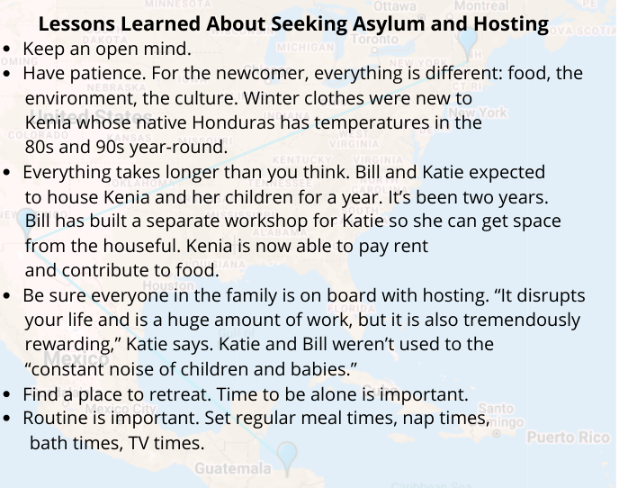 That was more than two years ago, years during which Kenia has lived with Bill and Katie, learned English, learned to drive, learned to eat vegetables, worked with an attorney for many months on her asylum application, put her children into daycare, pre-school and school, gotten a work permit and a job at Machina Kitchen in Keene and recently landed a position as a facility assistant at the WS Badger Co.