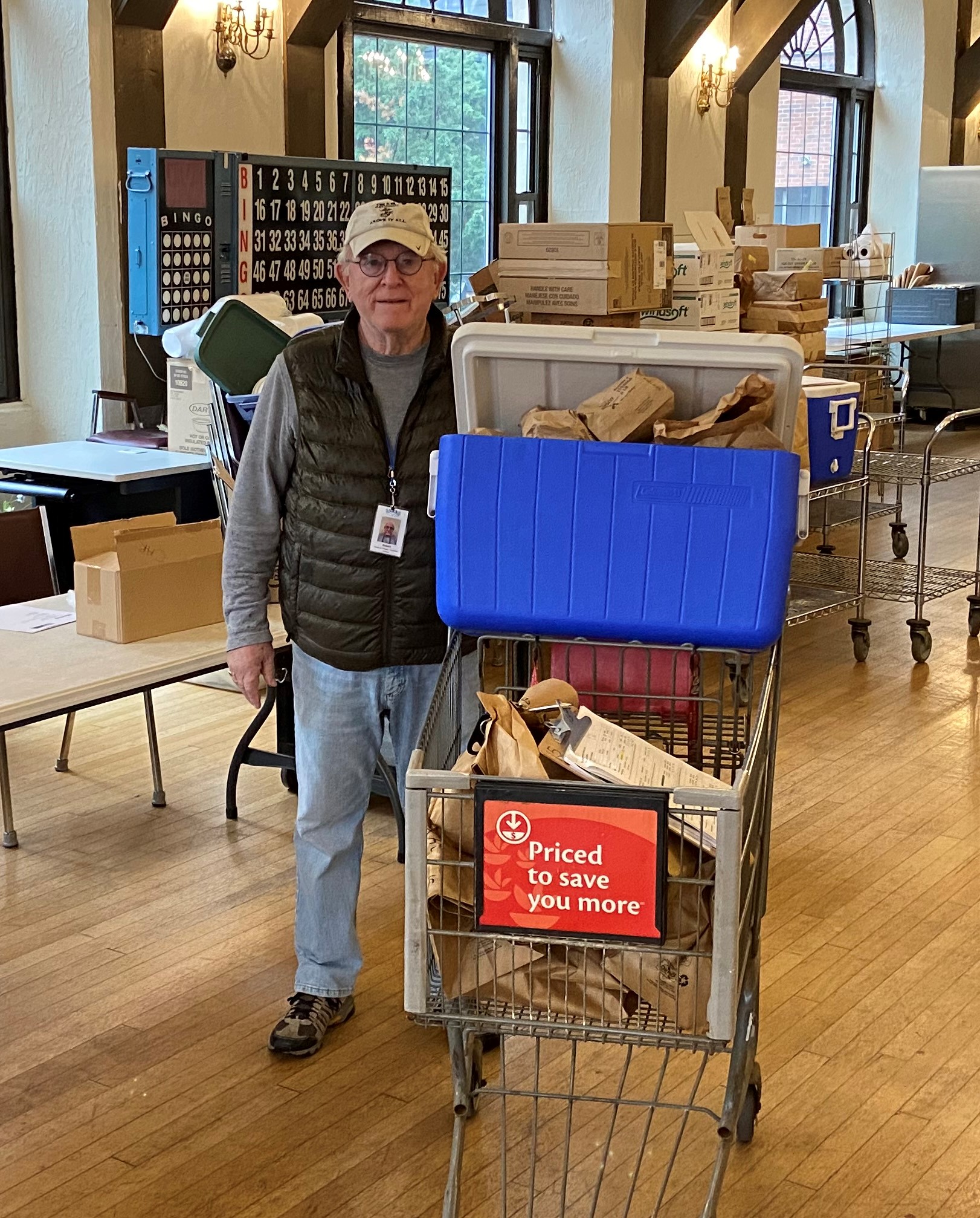 Back inside the Carpenter Center, where meals are packaged and put together, Bob – who’s been volunteering for about two years – and other volunteers take part in a quick meeting led by Site Director Frank Carpentino and Site Assistant Director Jessie Pinkham. Frank and Jessie review some paperwork that drivers need to be aware of and lead a discussion about a possible storm, which may alter the schedule going forward.