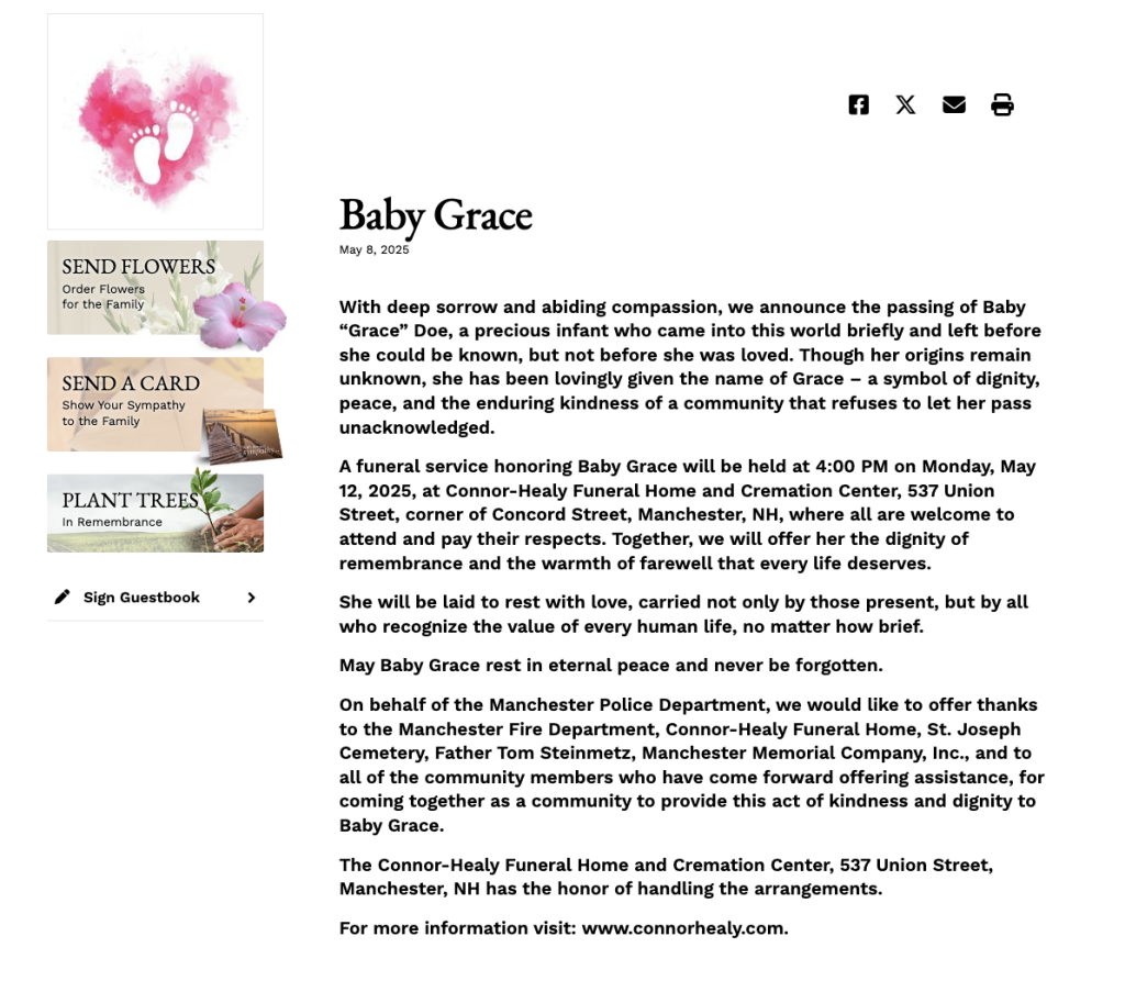 MANCHESTER, NH – Manchester Police on Thursday announced that a funeral service has been scheduled to honor the life of Baby “Grace” Doe, the unidentified infant discovered on March 27, 2025, in the water at Pine Island Park in Manchester.