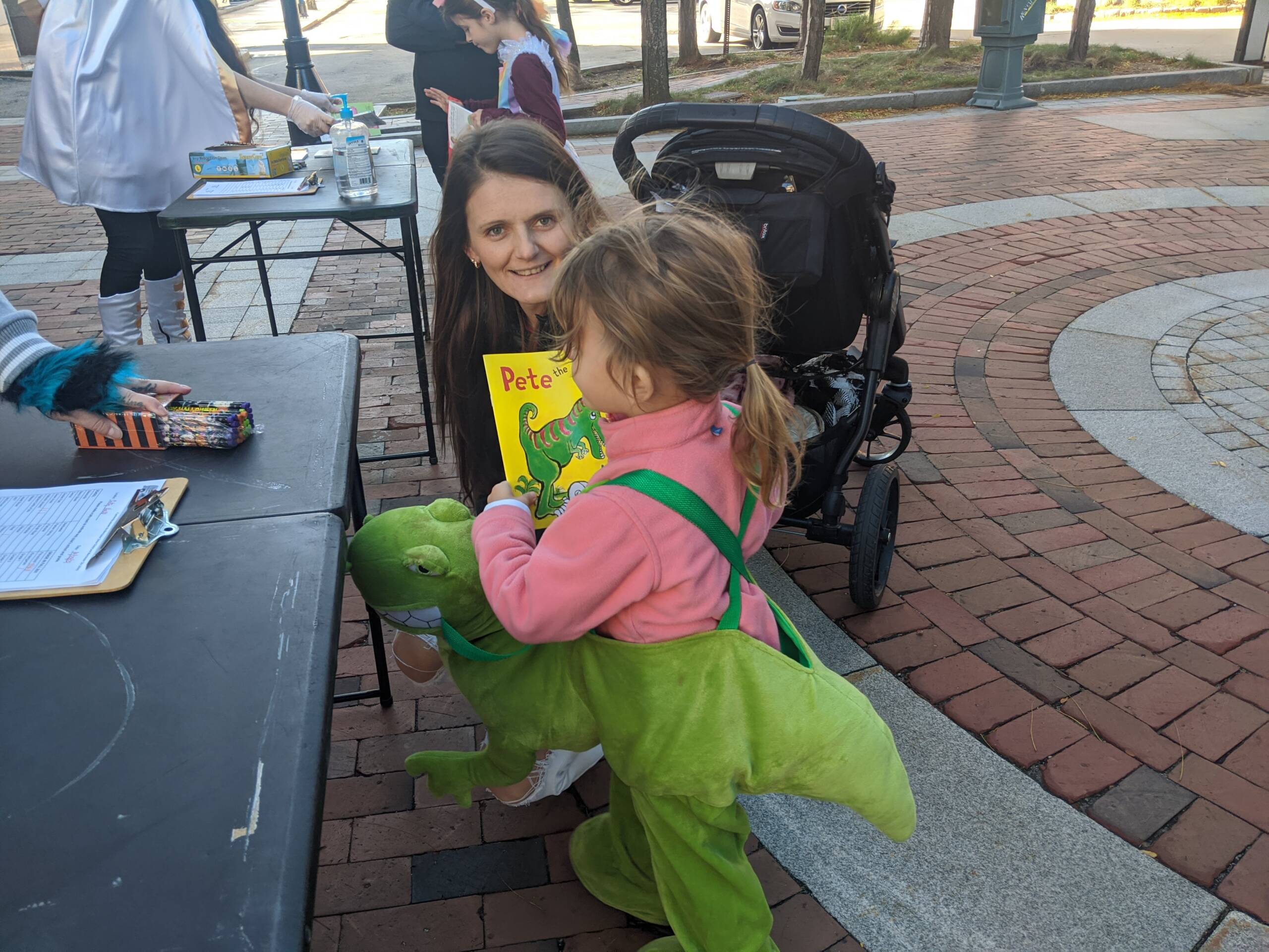 A dinosaur book for a tiny dinosaur at City Hall, courtesy of the Bookmobile. Photo/Carol Robidoux