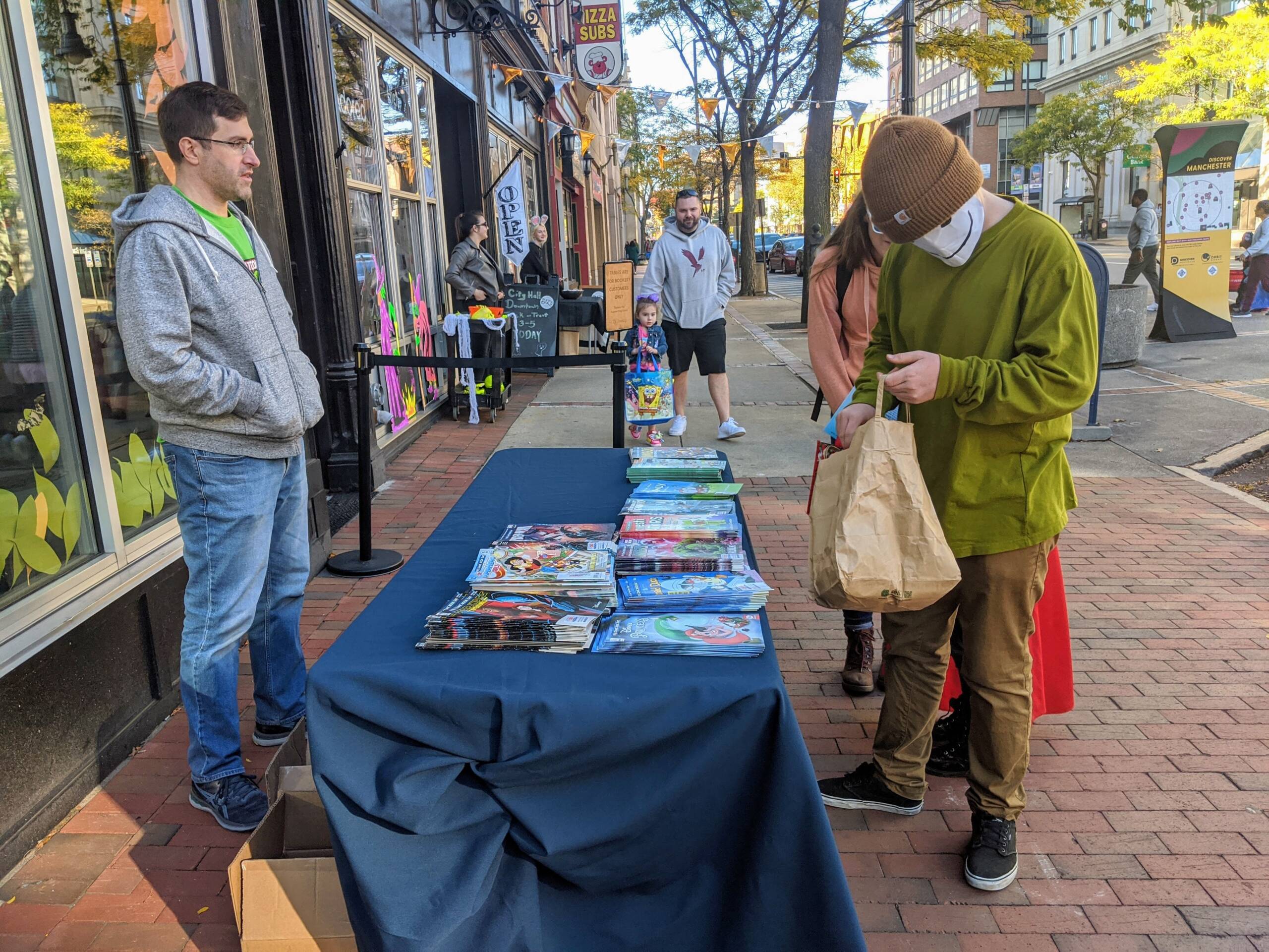 The annual Trick-or-Treat at City Hall benefitted from some cooperation from the weather – it was a lovely autumn afternoon for haunting the participating businesses, which handed out wrapped candy, lollipops, and even comic books outside the Bookery, courtesy of Double Midnight Comics, as well as free ice cream scoops at Ben & Jerry’s.