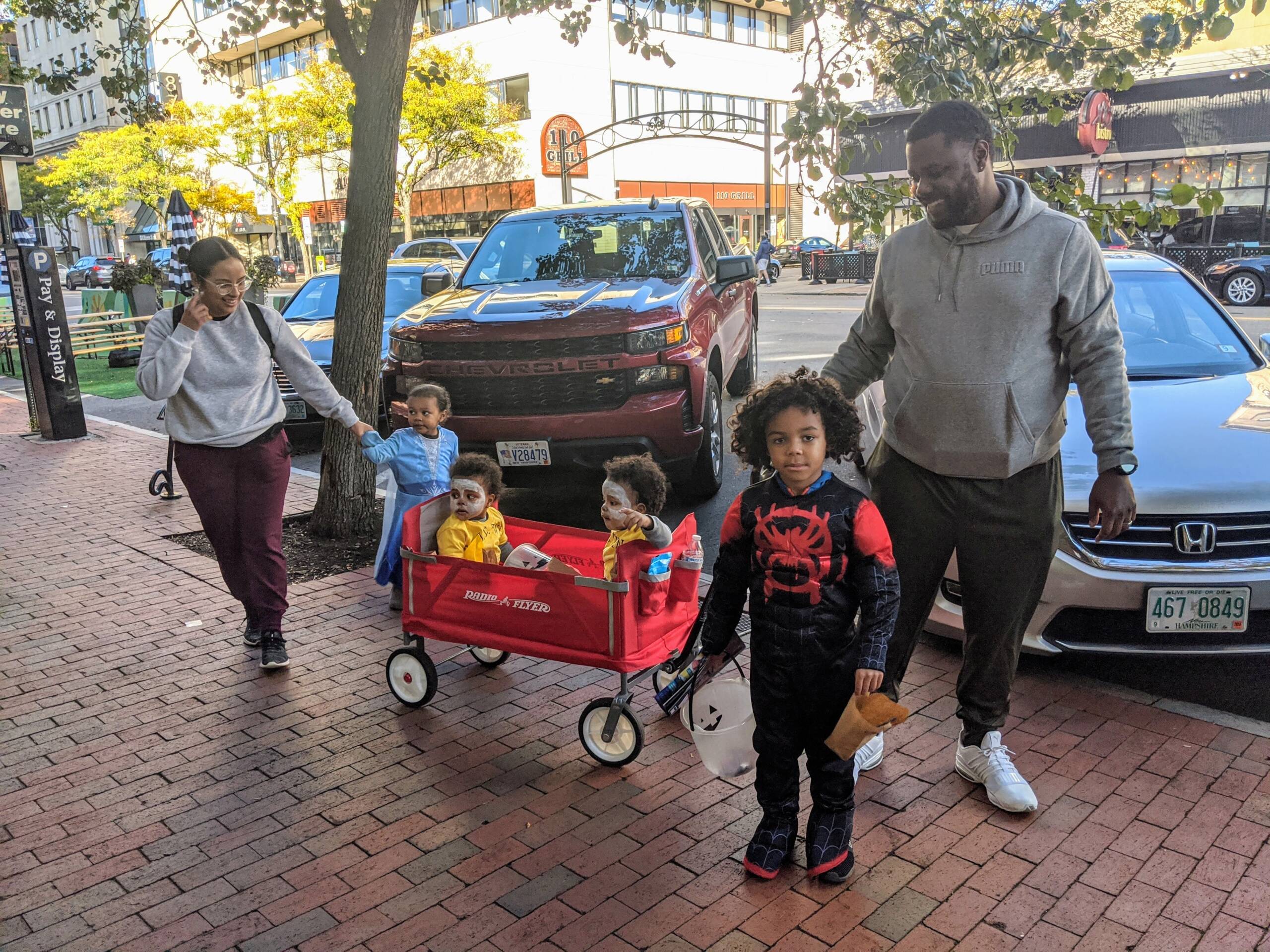 The Calderon family, including Emiliana, 3, Josan, 5, and “Skeletwins” Ezekiel and Eliso, age 1, in the wagon, out with mom and dad. Photo/Carol Robidoux