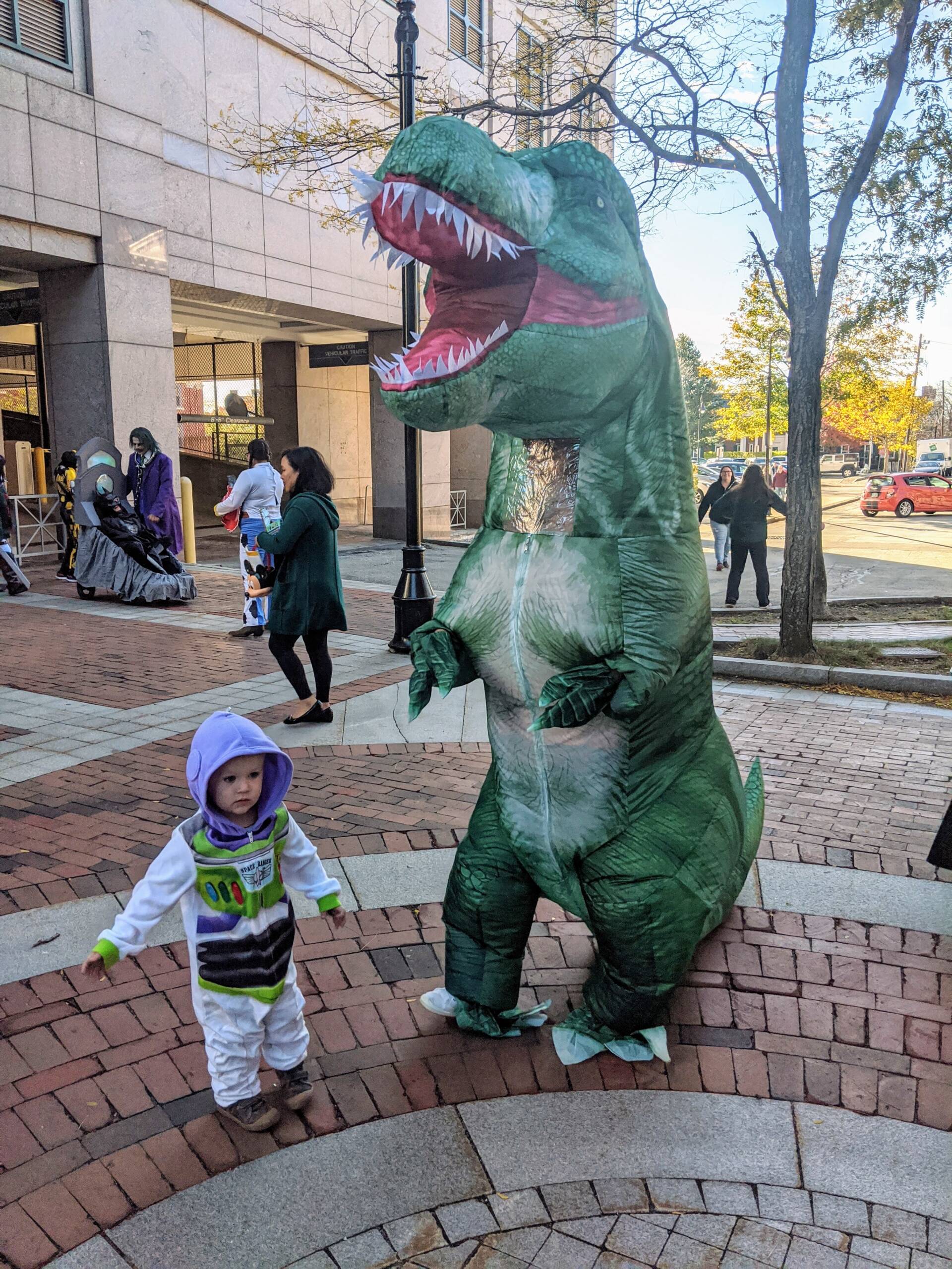 It was a mini-Toy Story reunion, as a little Buzz Lightyear got to hang out with a giant Rex at City Hall Plaza. Photo/Carol Robidoux