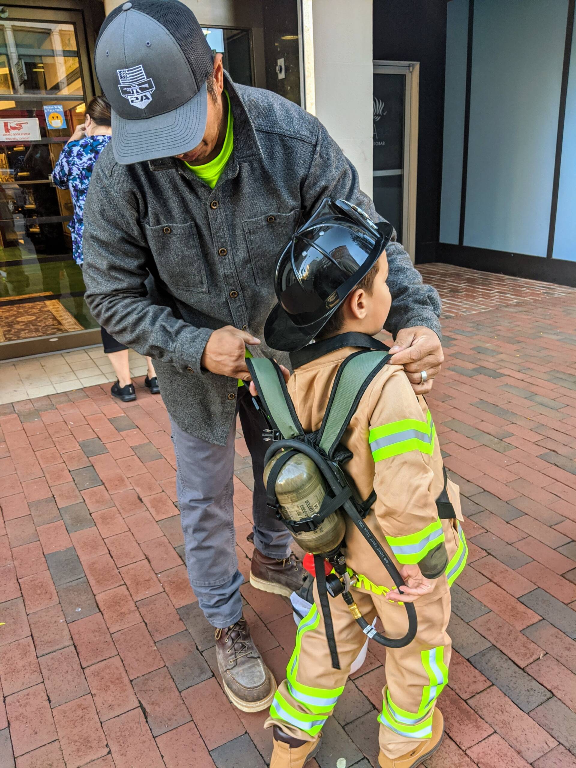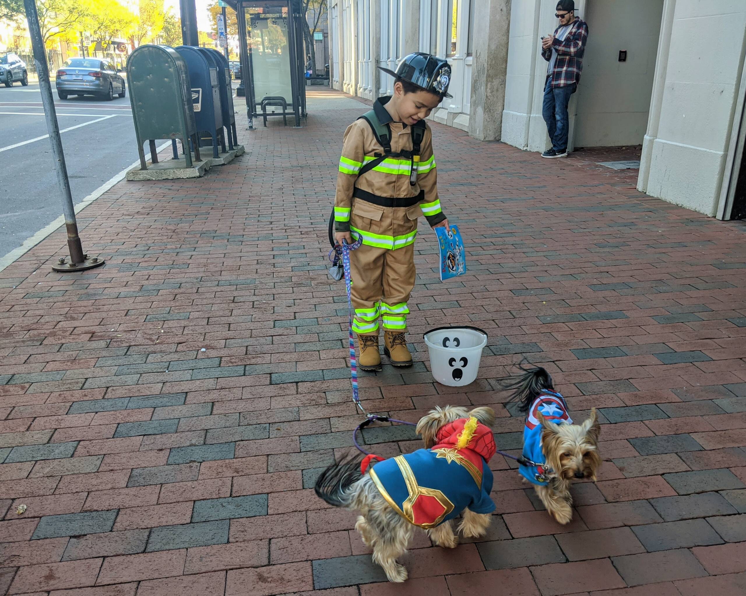Landon Khan, 5, looked authentic dressed as a firefighter, complete with an air supply pack, which his dad helped to adjust for him (below) as he made his way to City Hall, accompanied by Declan and Kerrigan, a pair of Yorkies his family was dog-sitting for the day.