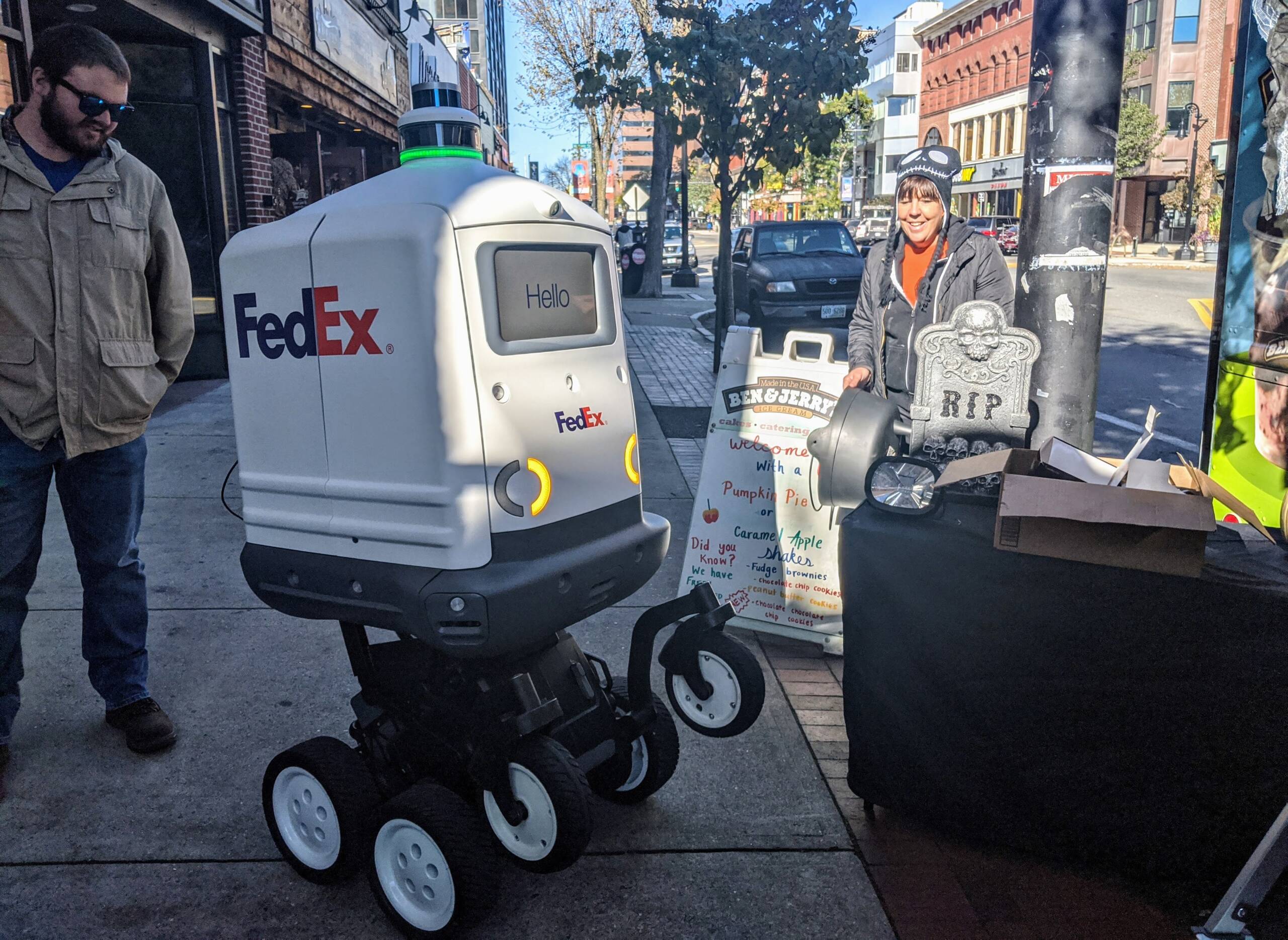 Lee Gentile, right, owner of Ben & Jerry’s encountered an actual robot that was not stopping by for free Halloween ice cream, but just trying to navigate the sidewalk. Photo/Carol Robidoux