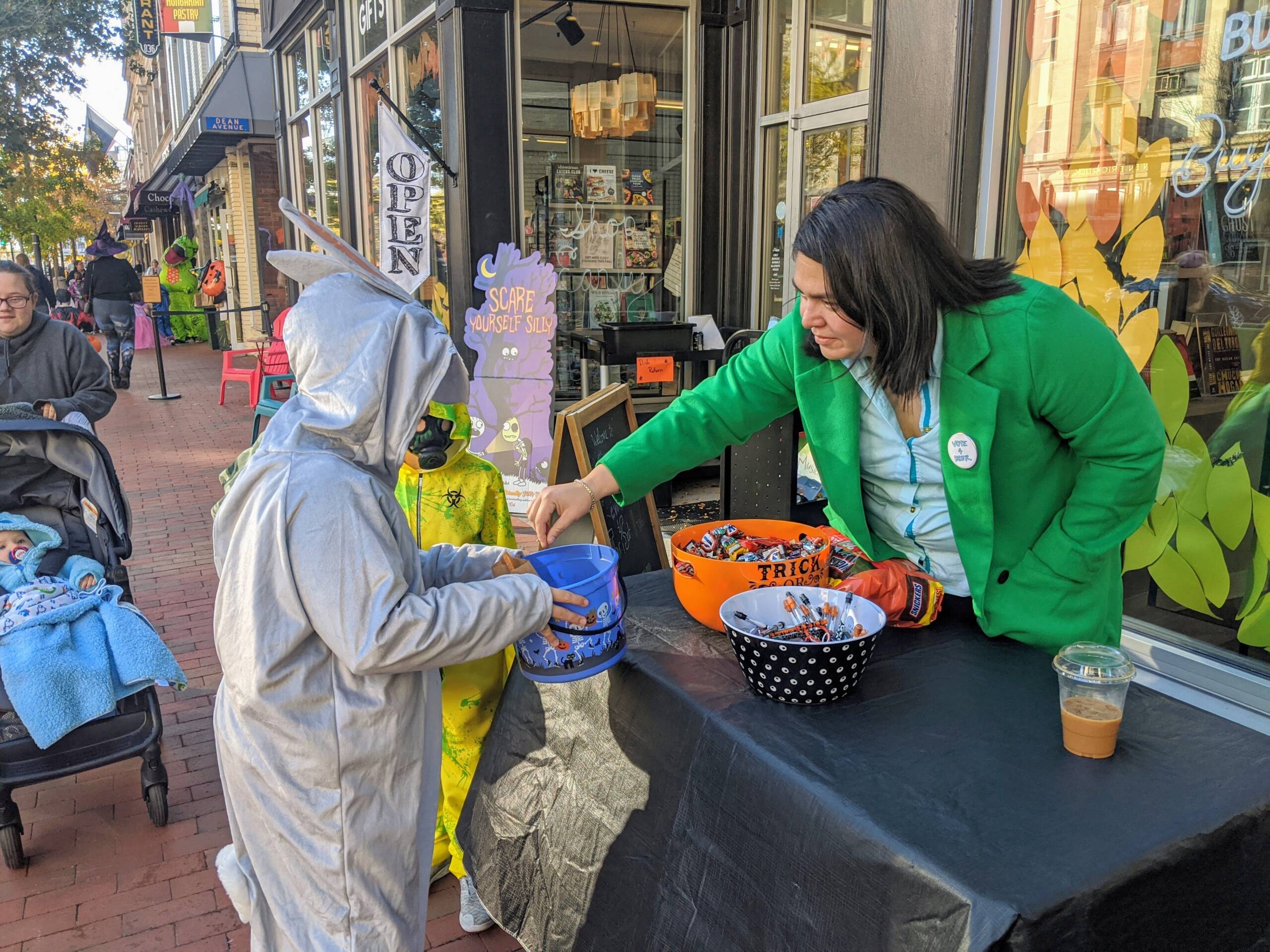 And no, that’s NOT Mayor Craig in the signature kelly-green coat but rather Mariana Beer dressed as a campaigning mayor with a “Vote for Beer” button, handing out candy in front of Bookery MHT. Photo/Carol Robidoux