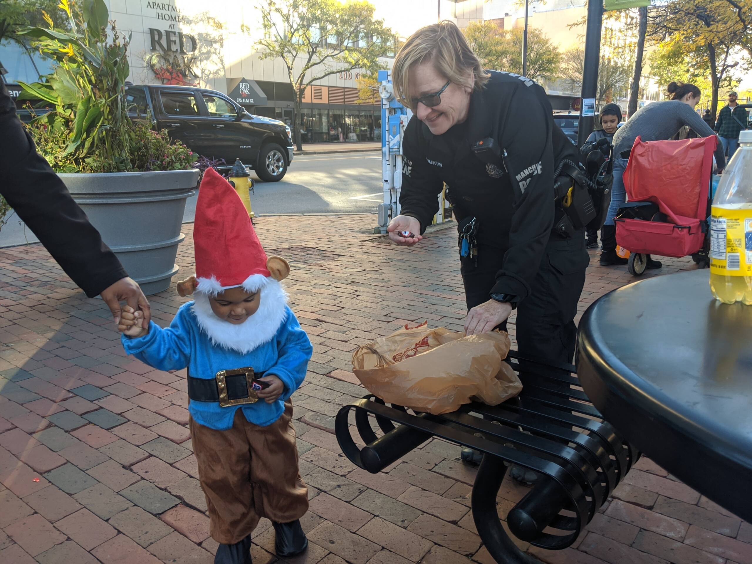 Manchester Police Officer Anna Martin bonding with Jensen Delacruz over a fun-size candy bar. “We’re just a couple of gnomes,” said Martin with a laugh – and while she may be pint-sized in stature, her big personality and Irish brogue are hugely popular with the downtown business owners she gets to know while patrolling on her bicycle beat.” Photo/Carol Robidoux