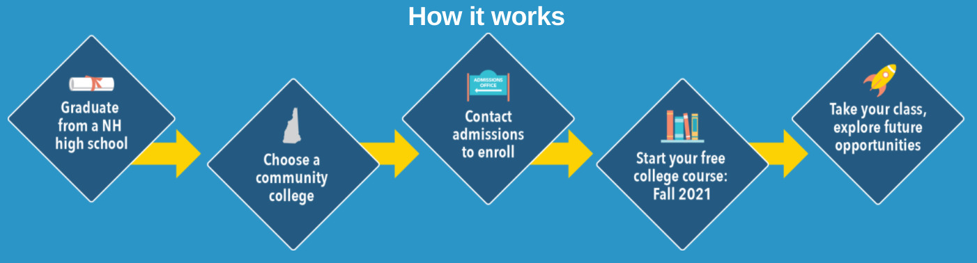 To enroll, eligible students should contact the admissions office at their local community college. Academic counselors will be available to help students choose courses. Students can choose an online, hybrid or in-person class. Graduating seniors who have already enrolled at a CCSNH college for the fall are also eligible for the class gift.