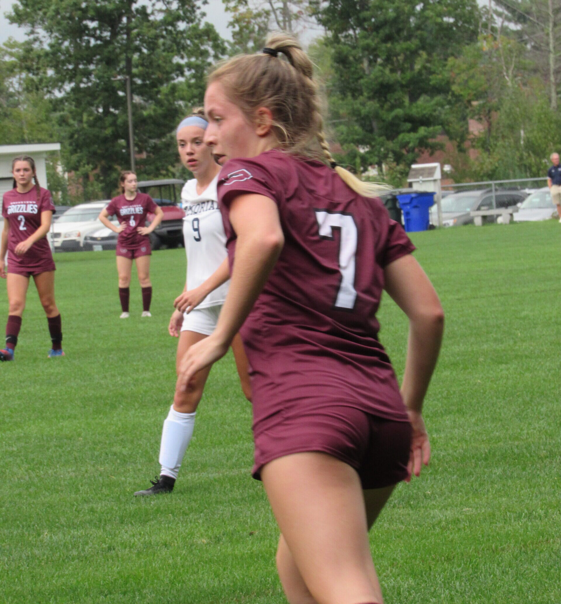 At several times during the match Goffstown Coach Nick D’Agostino pleaded with the referees for what he saw as play that was too aggressive by Memorial, citing unnamed “dirty fouls.” He saved the worst of his complaining for when Goffstown was up 6-0 and had just scored on a penalty kick, asking for red (game ejection) cards. Memorial’s Torle Adumene was given a yellow warning card shortly after for attempting to play the ball while on the ground, something she also did once in the first half.