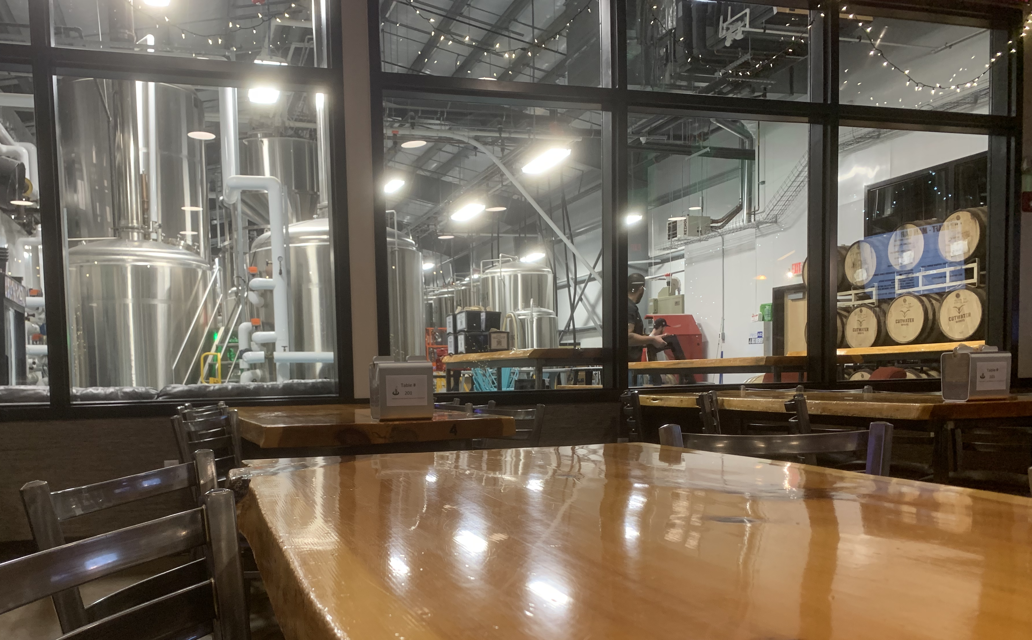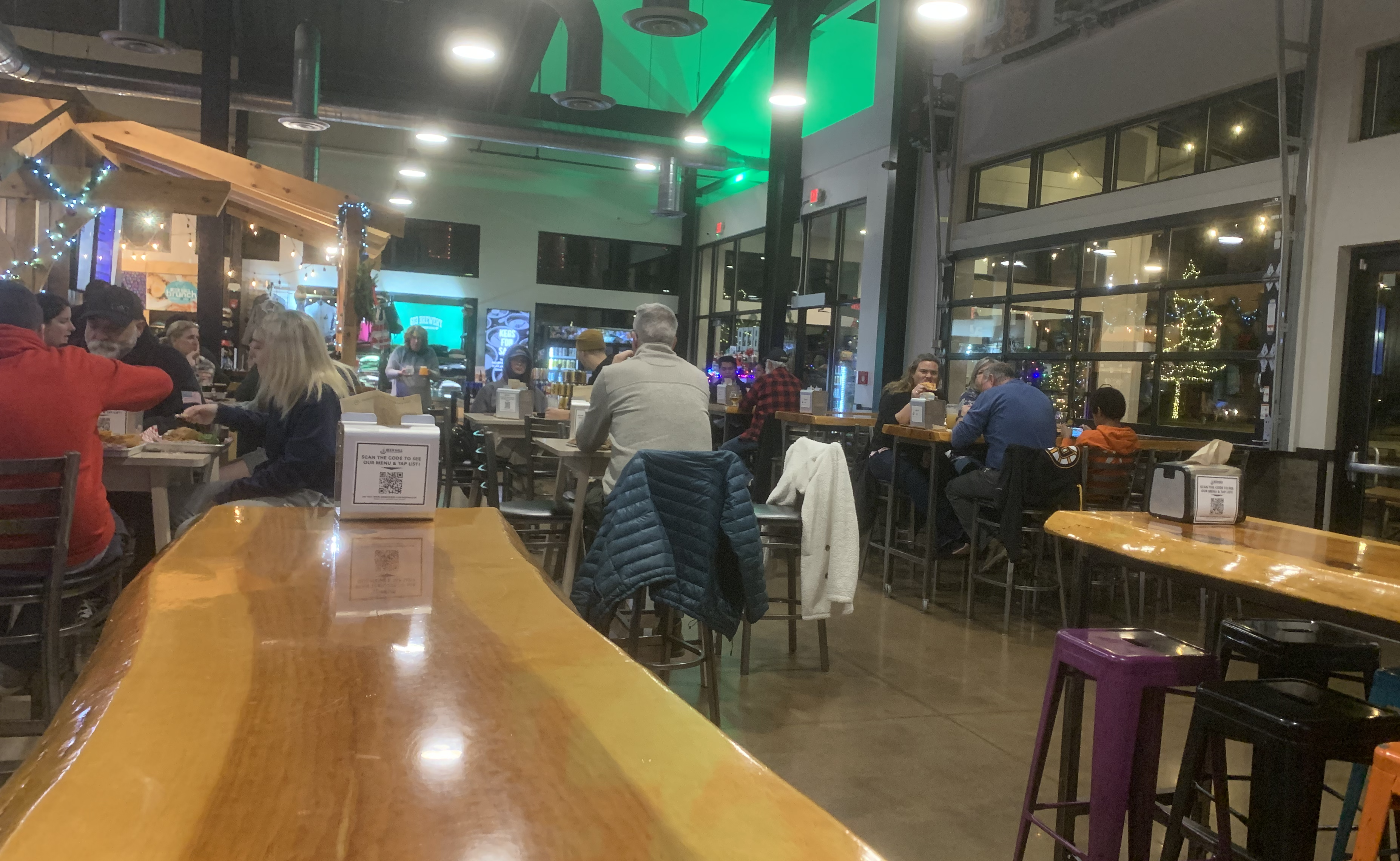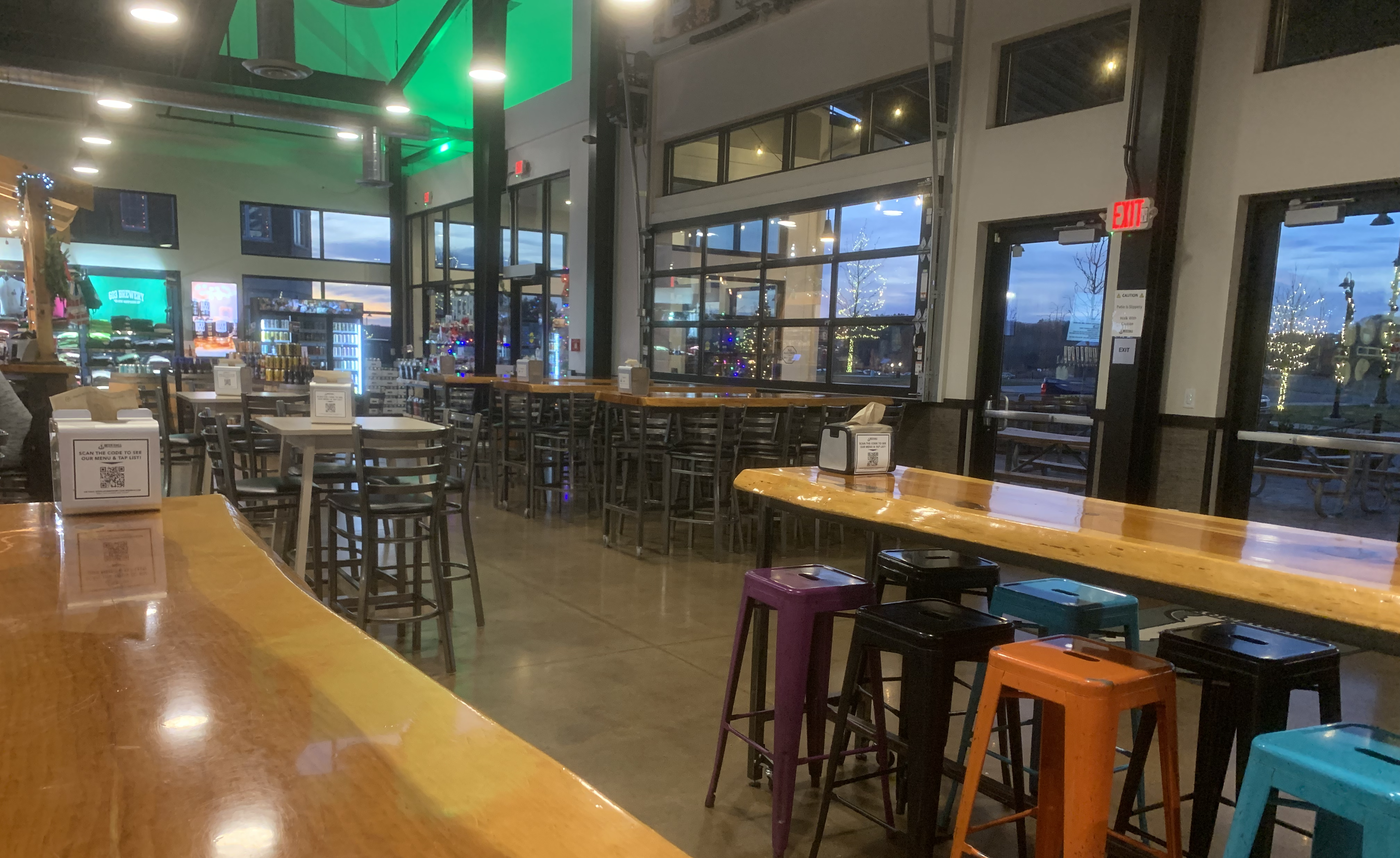 All tables were highly polished wood with live edges, adding warmth to what could easily be an industrial-feeling space. The view to the patio is through glass-paned garage doors that can slide upward in good weather. Below these doors is a half-height wall partitioning the room from the patio. I’m curious to come back during warmer weather.