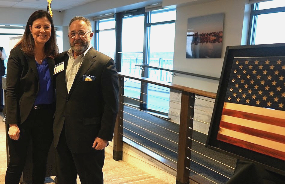 Former U.S. Sen. Kelly Ayotte, left, and FedPoint CEO Paul Forte with veteran-crafted wooden flag by Flags of Valor. Photo/Scot Villeneuve