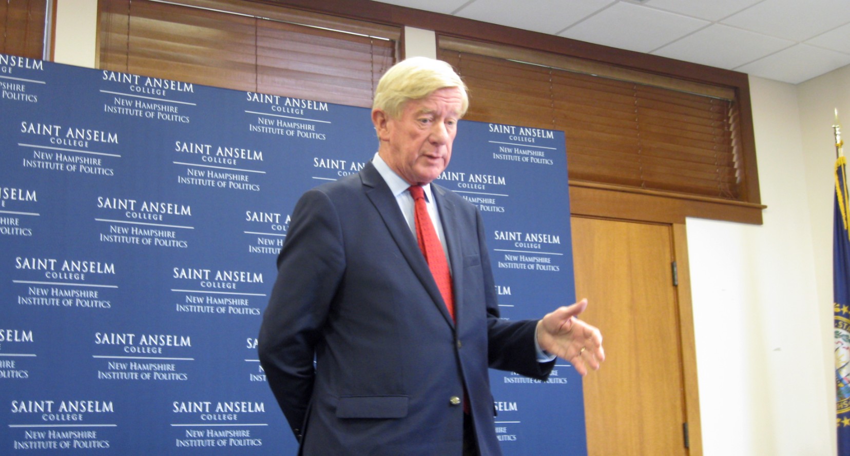 MANCHESTER, NH — Former Massachusetts Gov. Bill Weld dropped by Saint Anselm College Monday to deliver a guest lecture on New Hampshire’s first-in-the-nation primary and, by the way, remind students and guests that he’s running against Donald Trump for the 2020 Republican presidential nomination.